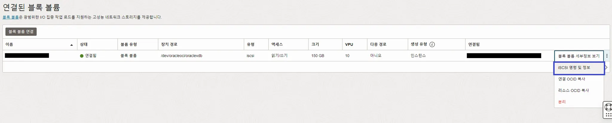 연결을 원하는 볼륨의 우측 … 메뉴를 누르고 파란색 사각형으로 표시된 iSCSI 명령 및 정보 항목을 클릭하면 iSCSI 명령을 알 수 있다.