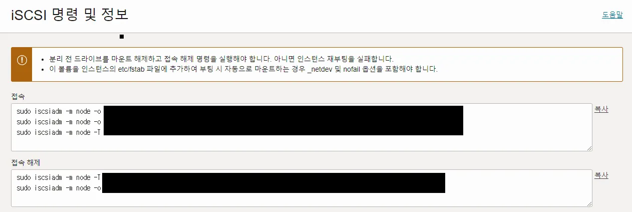 접속 부분에 있는 명령어를 그대로 복사해서 VM에서 사용하면 iSCSI 볼륨을 연결할 수 있다.