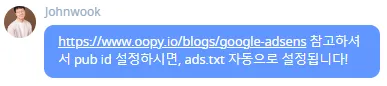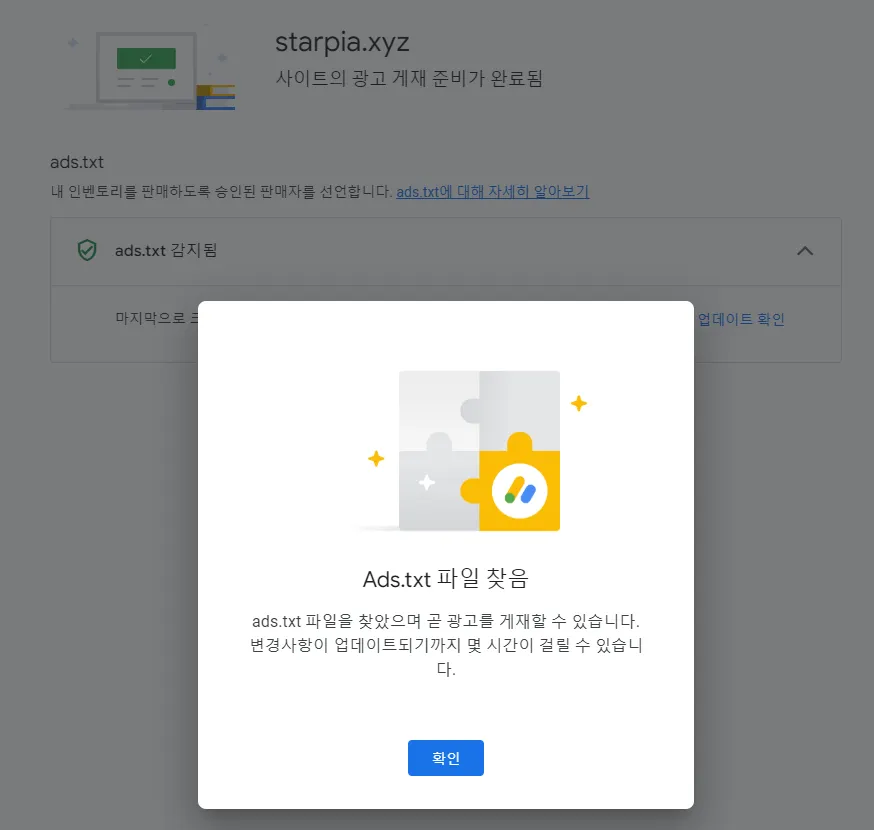 우피 가이드라인에 따라 Google adsense 메뉴에서 웹 게시자 ID 를 등록해주자 곧 바로 ads.txt 파일이 확인됐다.