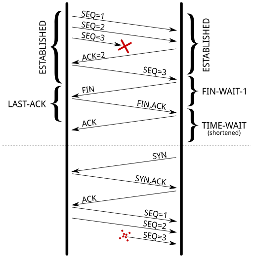 다음의 예시는 TIME-WAIT 상태가 충분히 길지 않을 경우에 발생할 수 있는 문제 상황에 대한 예시 그림이다.
